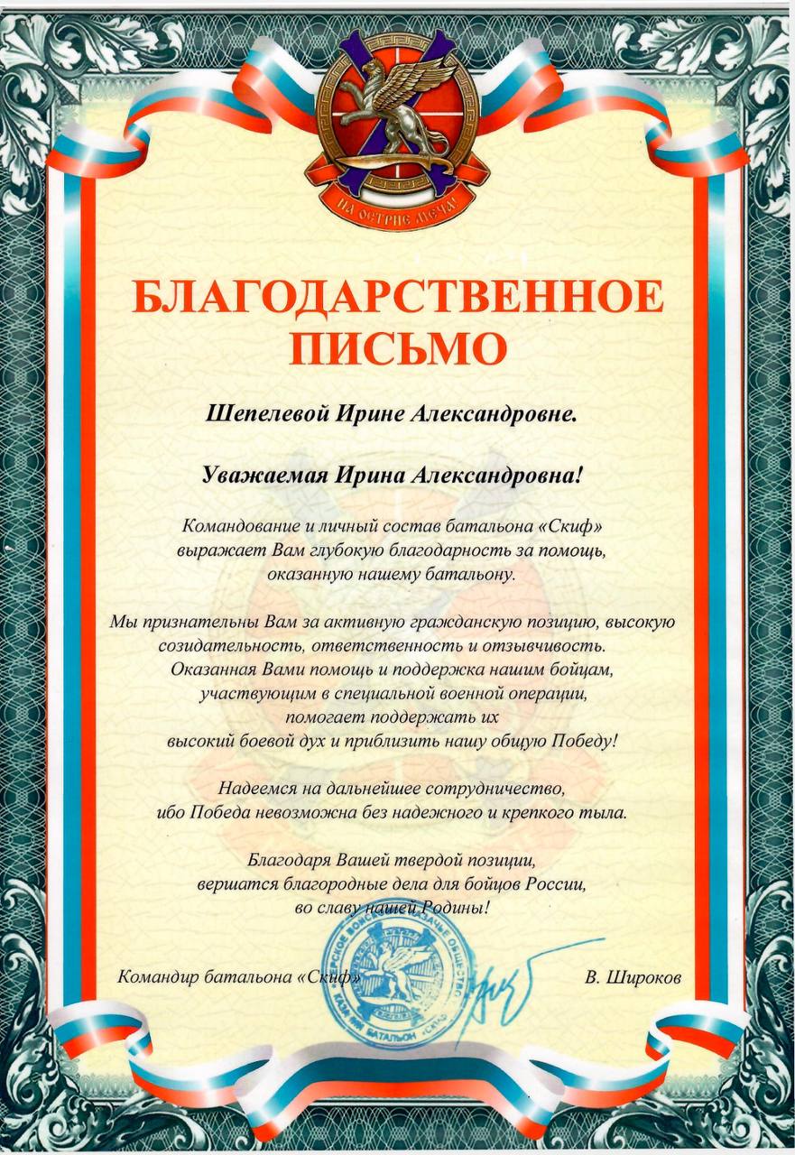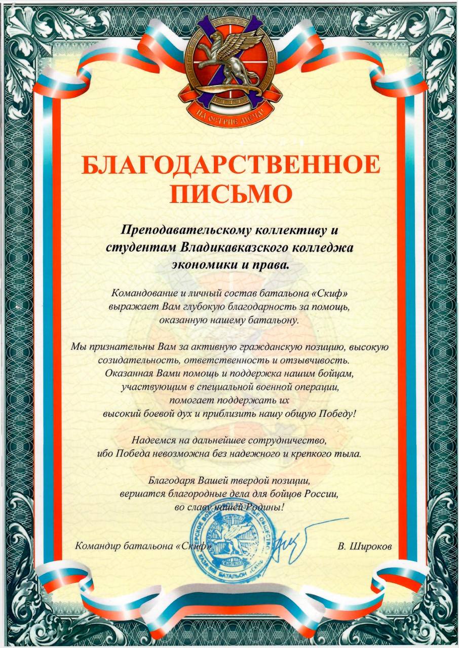 Коллектив и студенты Владикавказского колледжа экономики и права удостоились благодарности от командира батальона «Скиф» В. Широкова.
